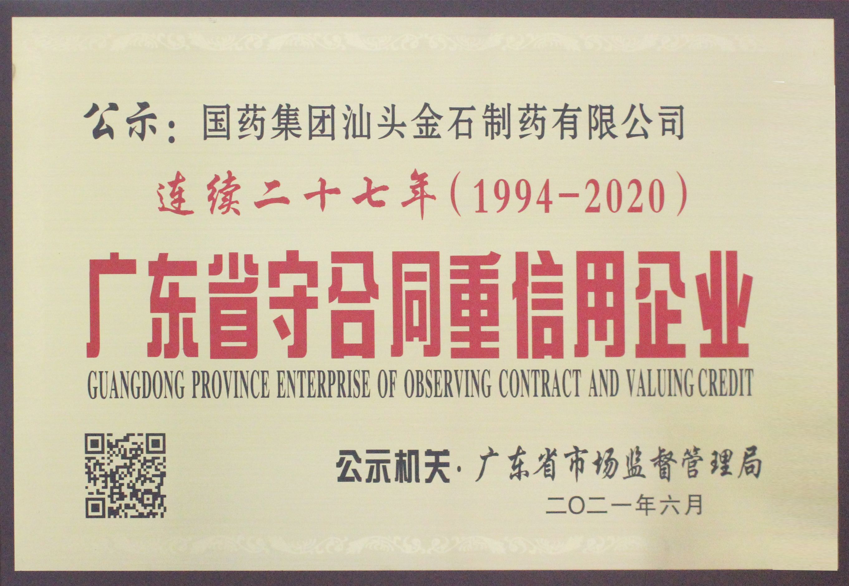 连续二十七年广东省“守合同重信用”企业牌匾