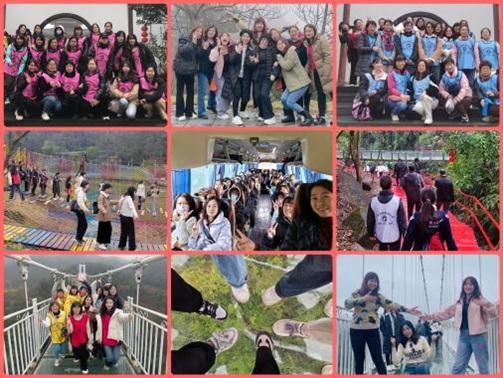 活动当天,气温骤降,阴天转雨,雾笼鮀城,然而“戏精”天气却抵挡不了女职工团建的步伐,大家风雨无阻,准时赴约。团建活动内容十分丰富:徒步、拓展、挑战玻璃桥、参观红色展馆、观看红色剧场,集休闲娱乐和团结协作于一体,女职工们精神振奋、奋勇争先,整场活动紧张激烈而又趣味横生,欢笑声络绎不绝。